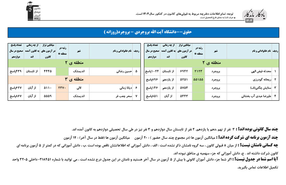 یادگار ماندگار : قبولی های کانونی دانشگاه آیت الله بروجردی بروجرد در همه رشته ها در سال 1404 را در ادامه مشاهده کنید.فایل با کیفیت قبولی های سال 1404 را در قسمت فایل های ضمیمه دانلود کنید.