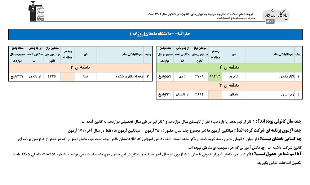 یادگار ماندگار : قبولی های کانونی دانشگاه دامغان در همه رشته ها در سال 1404 را در ادامه مشاهده کنید.فایل با کیفیت قبولی های سال 1404 را در قسمت فایل های ضمیمه دانلود کنید.