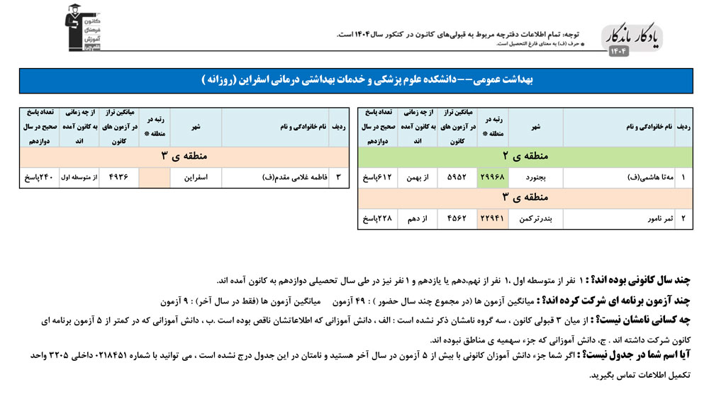 یادگار ماندگار : قبولی های کانونی دانشگاه علوم پزشکي اسفراین در همه رشته ها در سال 1404 را در ادامه مشاهده کنید.فایل با کیفیت قبولی های سال 1404 را در قسمت فایل های ضمیمه دانلود کنید.