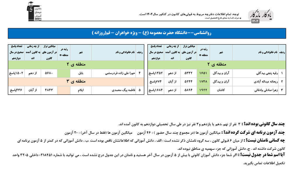 یادگار ماندگار : قبولی های کانونی دانشگاه حضرت معصومه قم در همه رشته ها در سال 1404 را در ادامه مشاهده کنید.فایل با کیفیت قبولی های سال 1404 را در قسمت فایل های ضمیمه دانلود کنید.