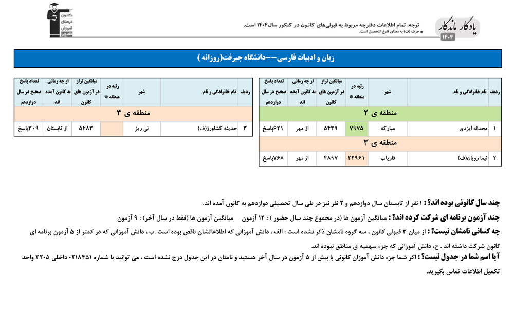 یادگار ماندگار : قبولی های کانونی دانشگاه جیرفت در همه رشته ها در سال 1404 را در ادامه مشاهده کنید.فایل با کیفیت قبولی های سال 1404 را در قسمت فایل های ضمیمه دانلود کنید.