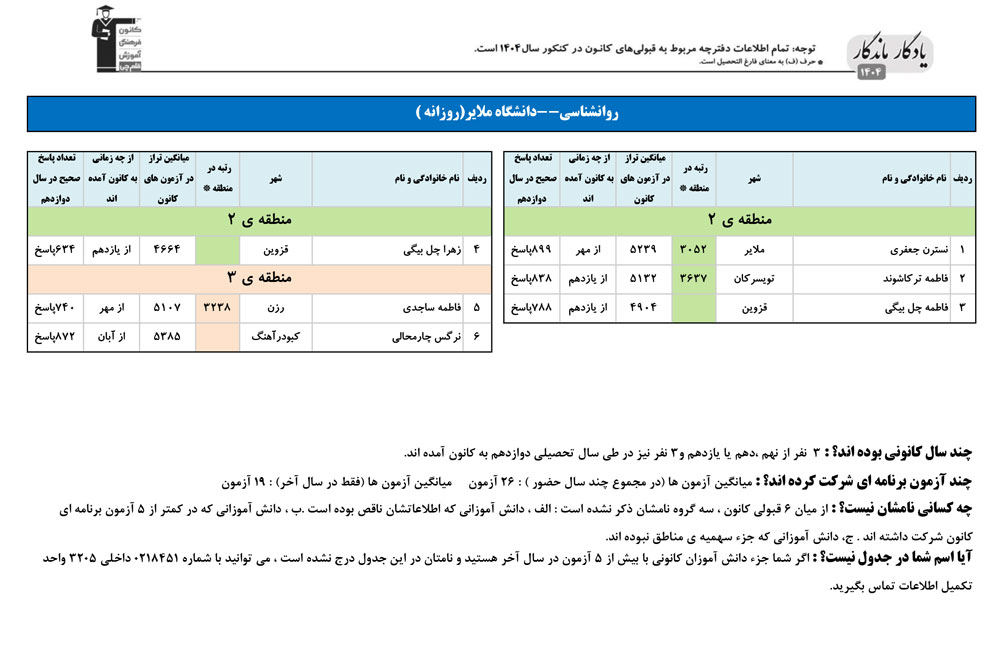 یادگار ماندگار : قبولی های کانونی دانشگاه ملایر در همه رشته ها در سال 1404 را در ادامه مشاهده کنید.فایل با کیفیت قبولی های سال 1404 را در قسمت فایل های ضمیمه دانلود کنید.