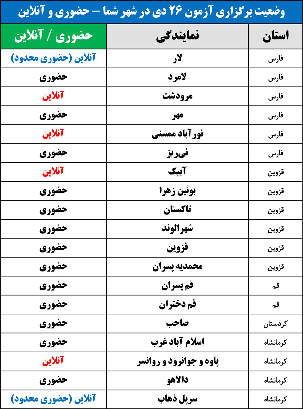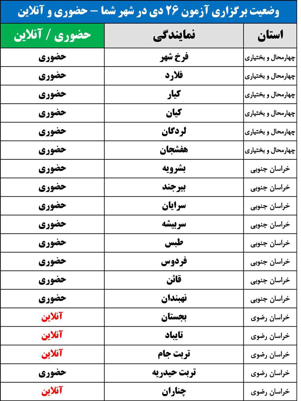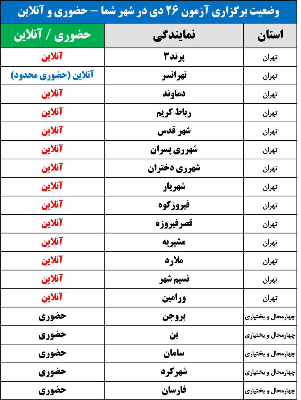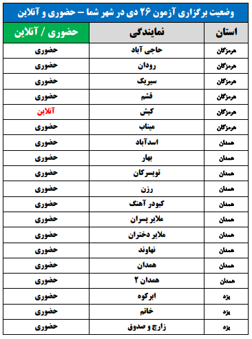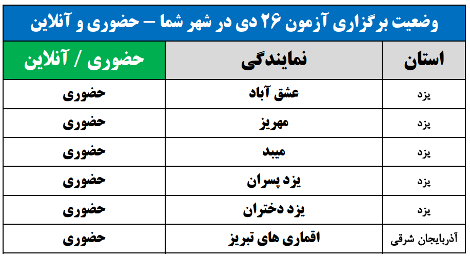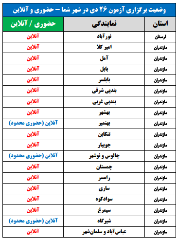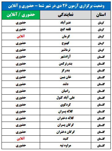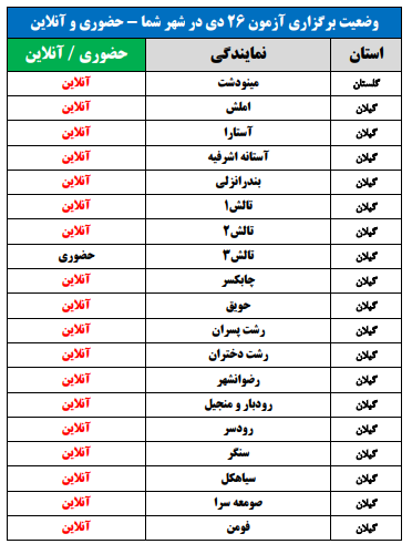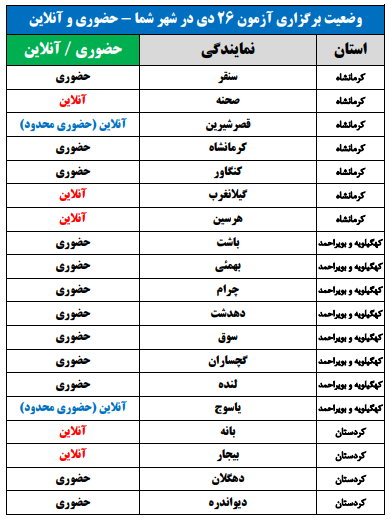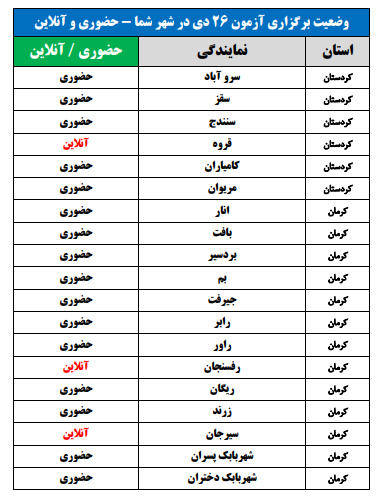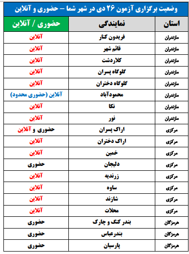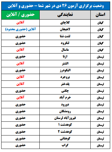 برای اطلاع از وضعیت برگزاری آزمون 26 دی در شهر شما(حضوری یا آنلاین)، جداول زیر را مشاهده نمایید:
