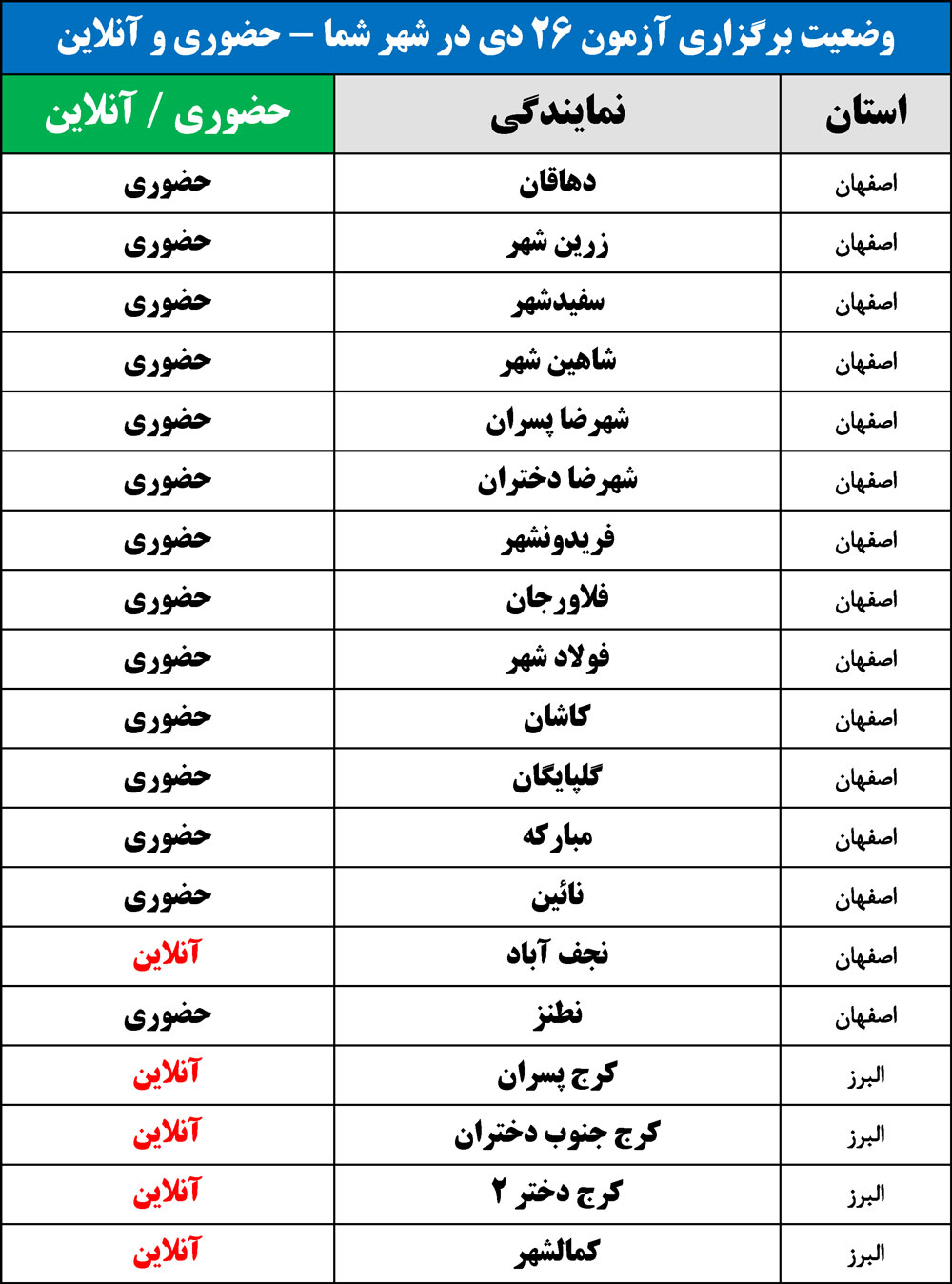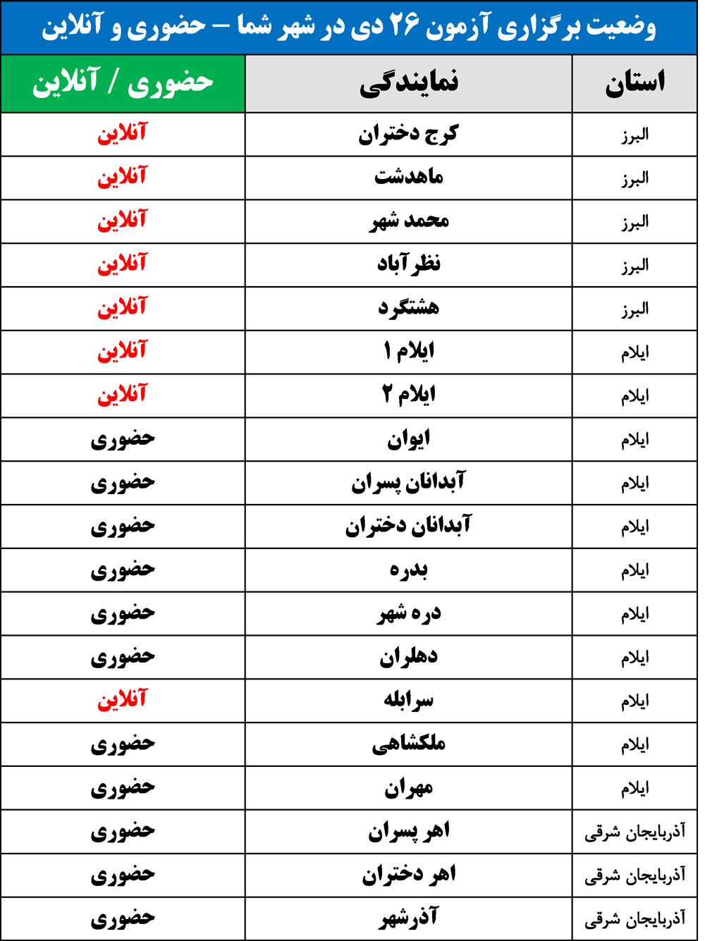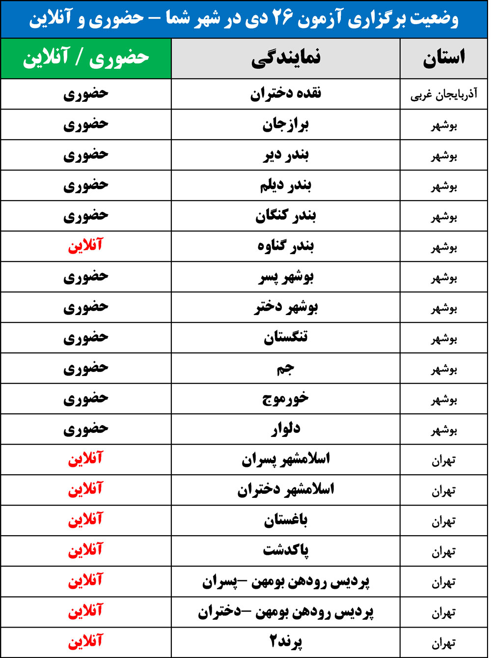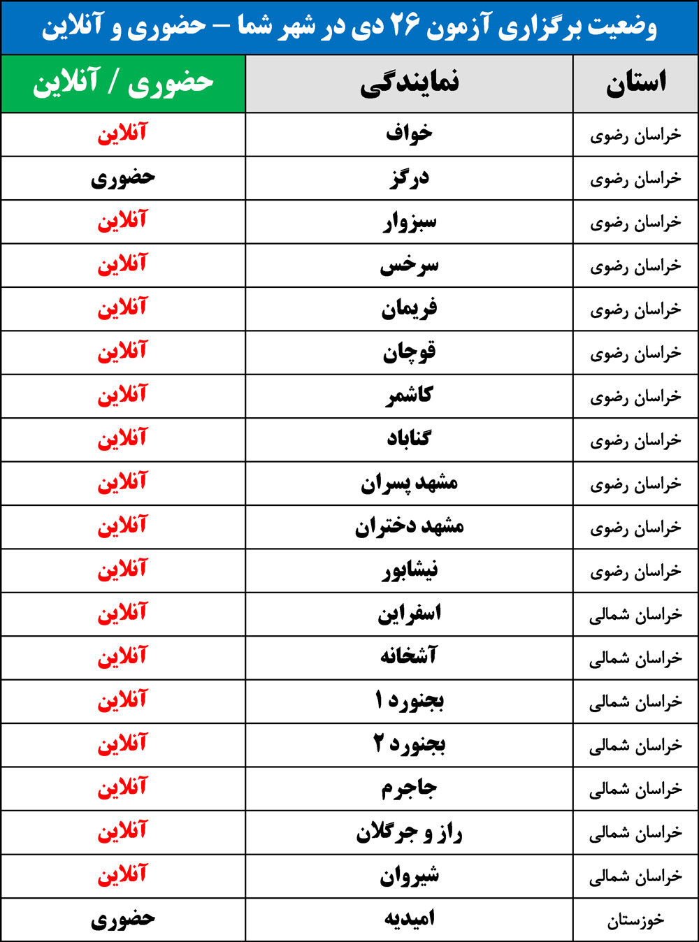 برای اطلاع از وضعیت برگزاری آزمون 26 دی در شهر شما(حضوری یا آنلاین)، جداول زیر را مشاهده نمایید: