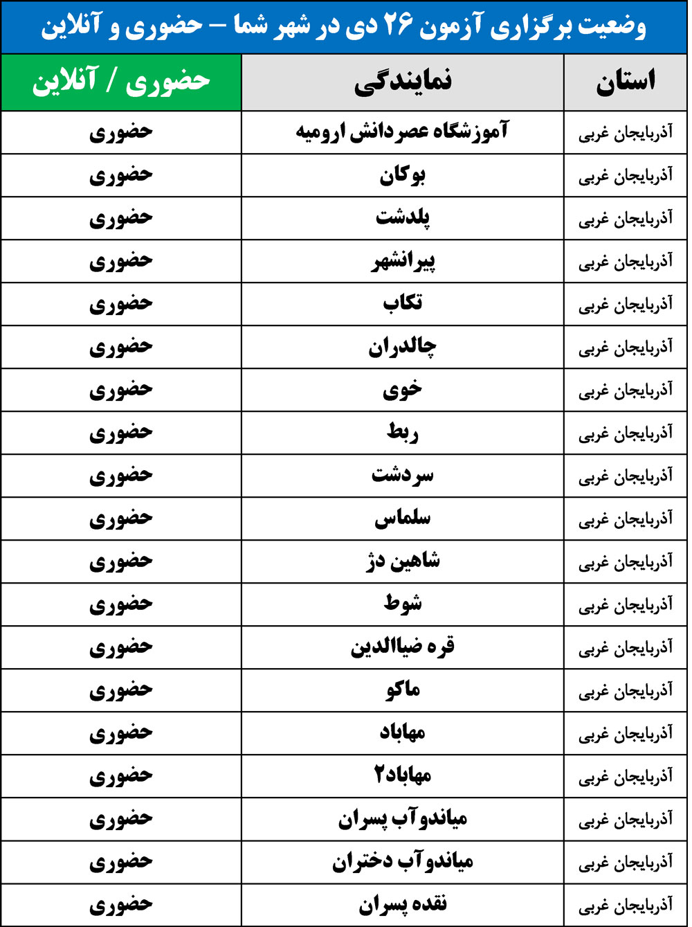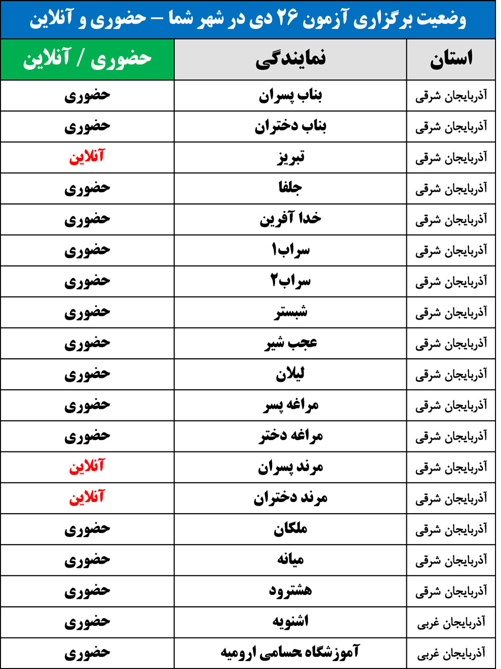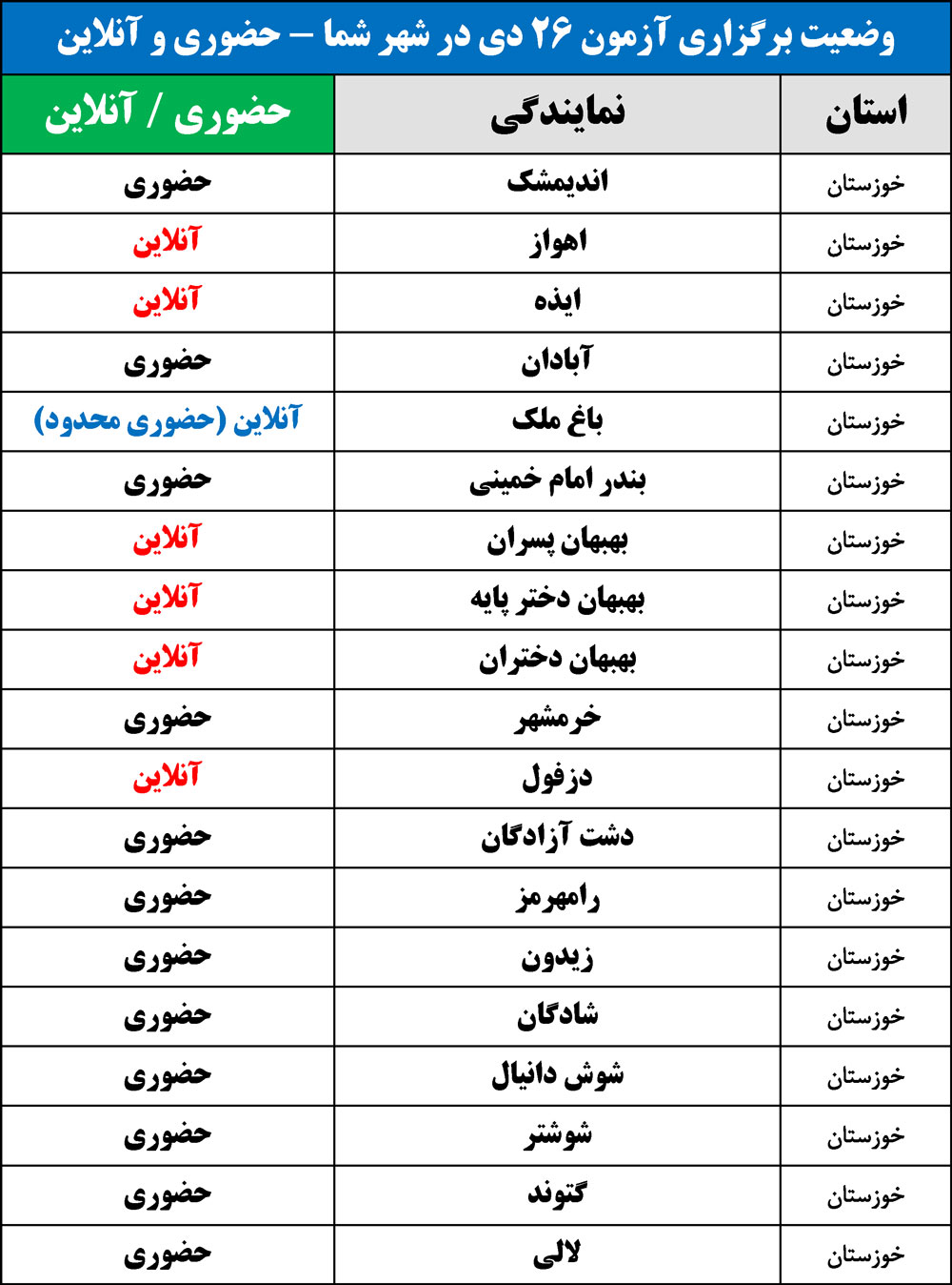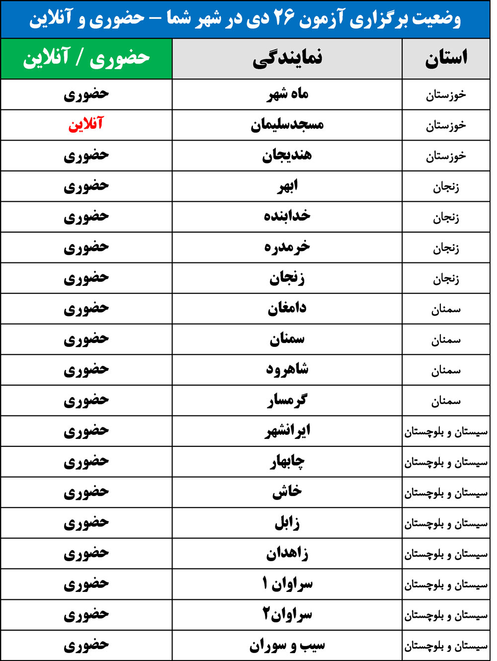 برای اطلاع از وضعیت برگزاری آزمون 26 دی در شهر شما(حضوری یا آنلاین)، جداول زیر را مشاهده نمایید: