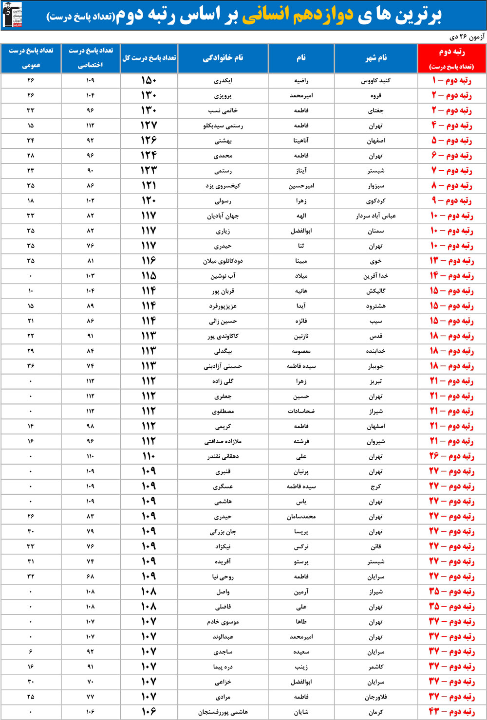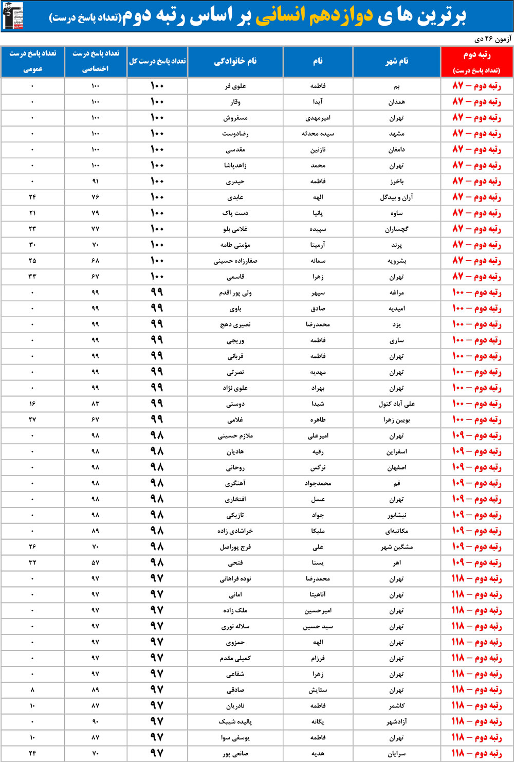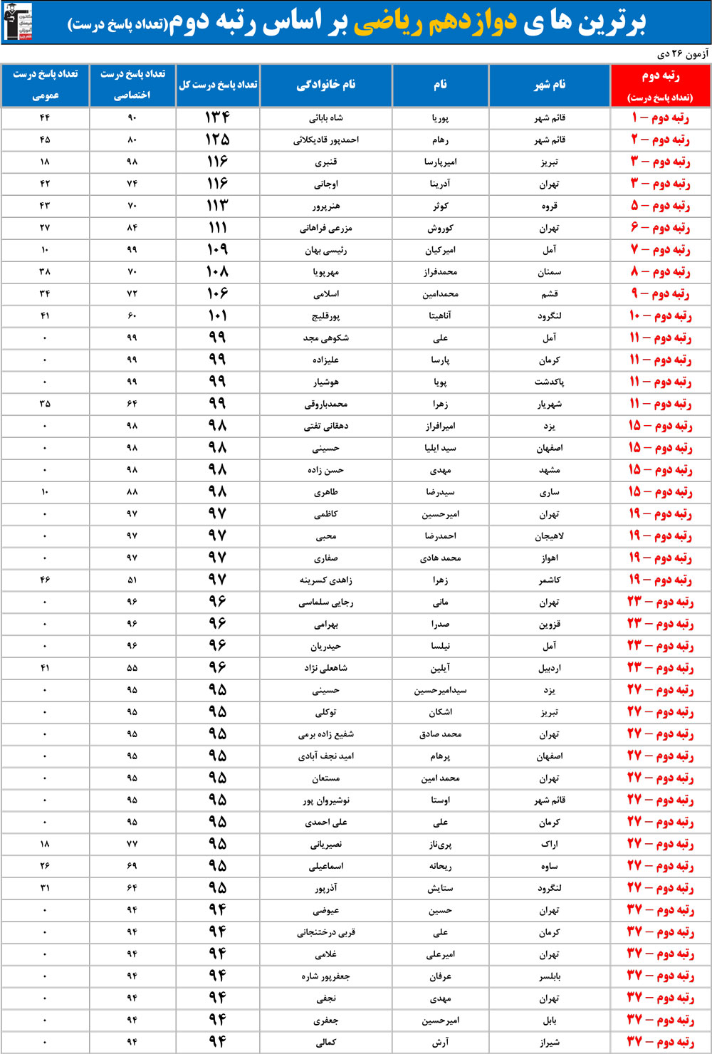 مهم : ممکن است چندین نفر رتبه مشابه داشته باشند زیرا تعداد پاسخ های درست آن ها مساوی است.