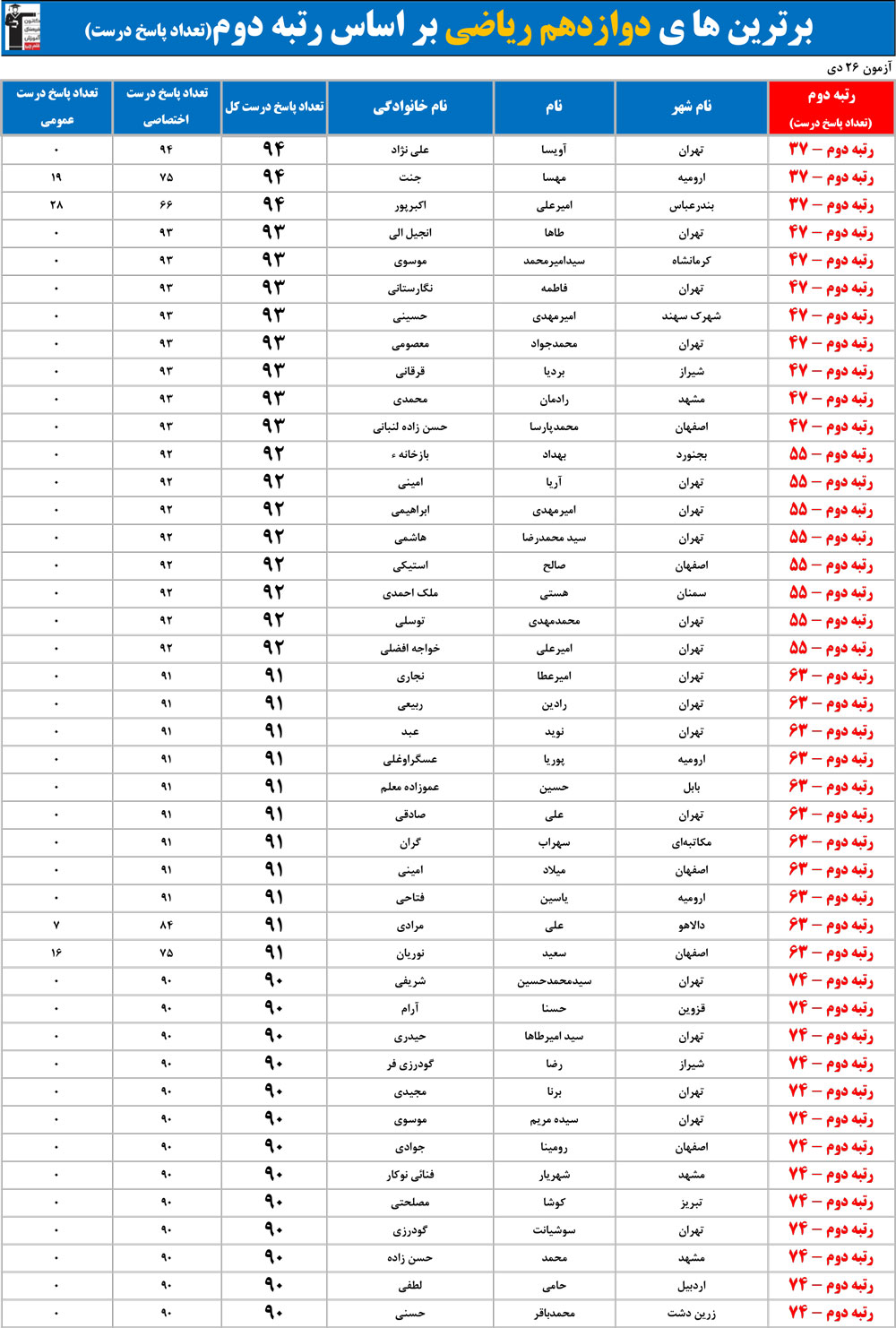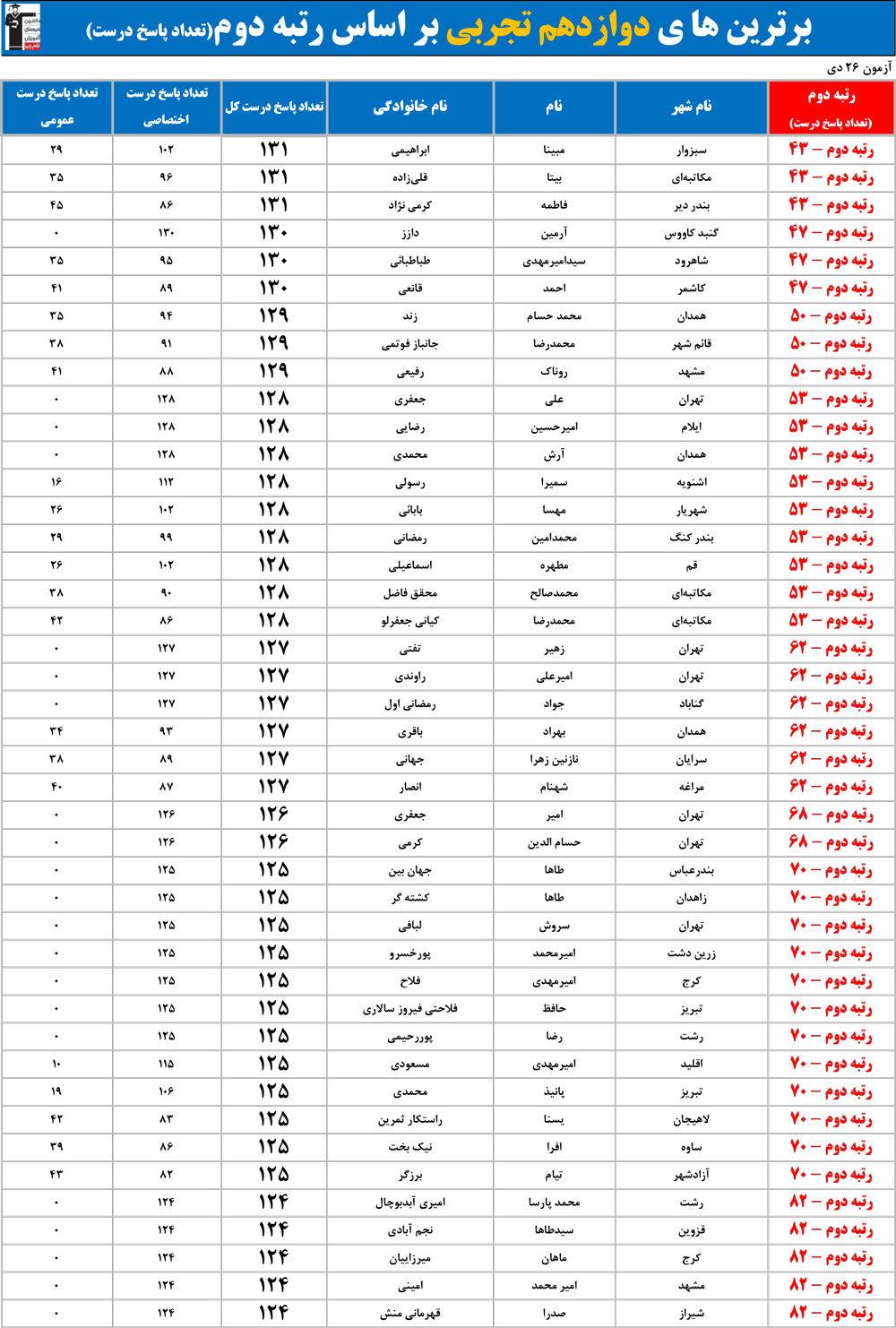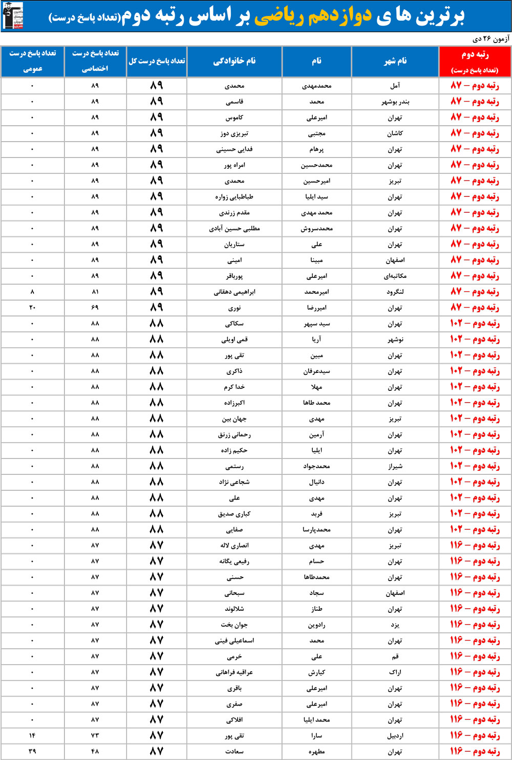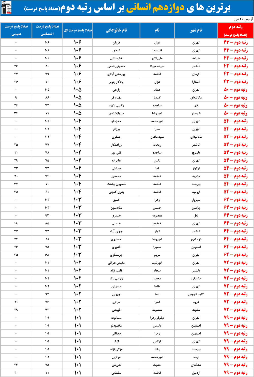 مهم : ممکن است چندین نفر رتبه مشابه داشته باشند زیرا تعداد پاسخ های درست آن ها مساوی است.