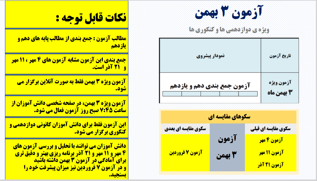 در آزمون 3 بهمن، همانند آزمون های 4 مهر، 11 مهر، 21 آذر پایه های دهم و یازدهم را جمع بندی می کنید.