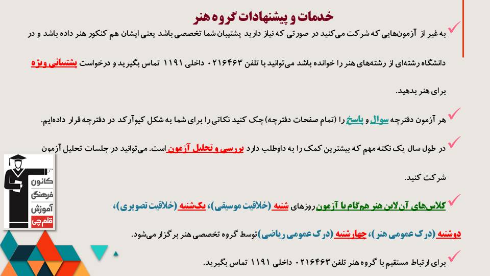 ریتم برنامه آزمونهای هنر نیمسال دوم: از آزمون 24 بهمن نیمسال دوم شروع میشود. هنر