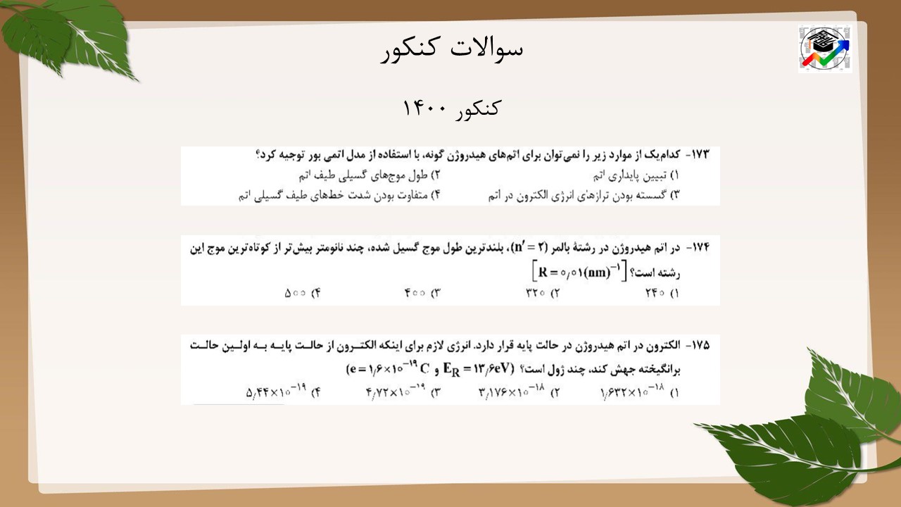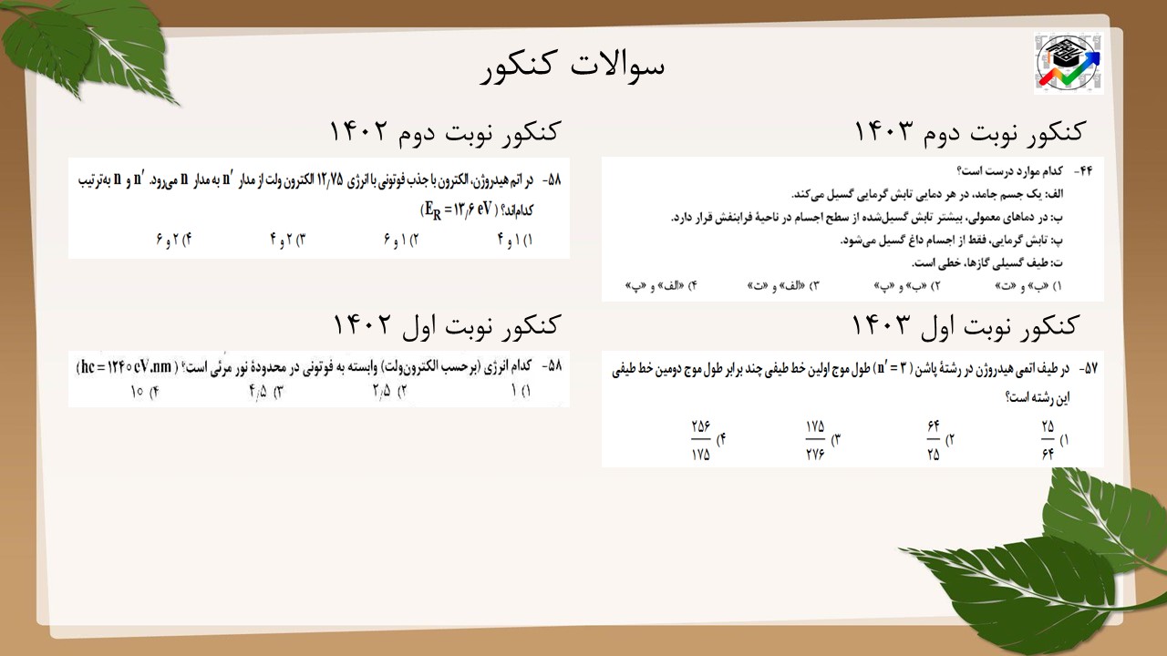 در ابتدا سوالاتی که از طیف خطی و مدلهای اتمی در امتحان نهایی آمده است را میبینیم.