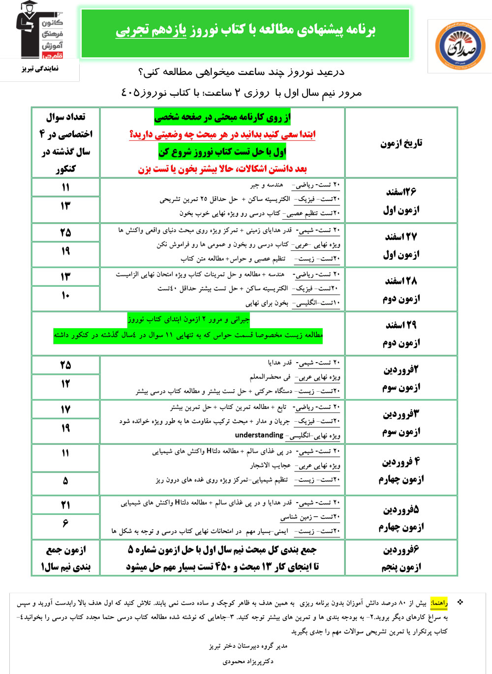 برنامه روزانه پیشنهادی دوران طلایی نوروز با محوریت کتاب نوروز و بازیابی مهمترین سوالات، مخصوص پایه های دهم و یازدهم و دوازدهم نمایندگی تبریز را در ادامه در قسمت فایل های ضمیمه مشاهده کنید..تهیه و تنظیم: پریزاد محمودی