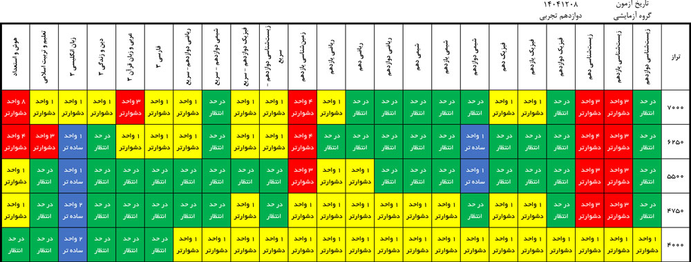 در این جدول برای هر درس رنگ های متفاوتی را می بینید .ممکن است یک درس برای یک بازه ی تراز دشوار و برای بازه ی تراز دیگر متعادل یا ساده باشد . ابتدا نمره ی تراز خود را در نظر بگیرید و سپس رنگ های هر درس را در بازه ی تراز خود ببینید . متوجه می شوید که آیا آن درس برای شما ساده تر از حد انتظار یا دشوارتر بوده یا این که متعادل بوده است .
