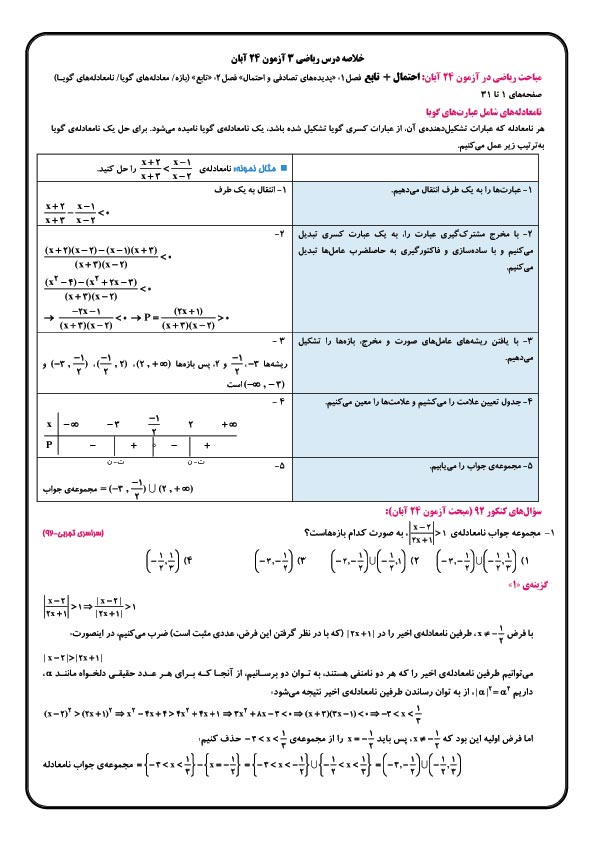 مباحث ریاضی در آزمون 24 آبان: احتمال + تابع فصل1: «پدیدههای تصادفی و احتمال» فصل2: «تابع» (بازه/ معادلههای گویا/ نامعادلههای گویا) صفحههای 1 تا 31...