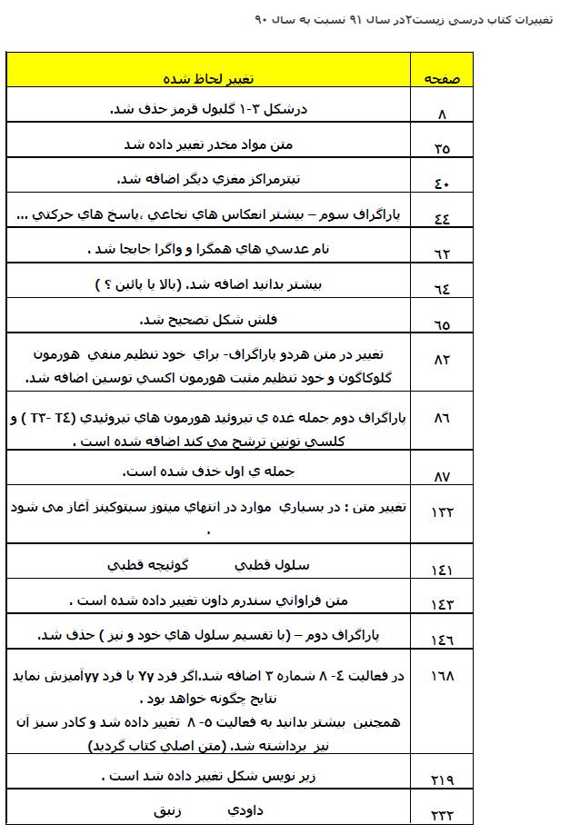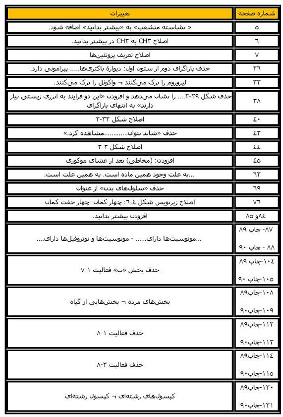 كتابهاي زيست شناسي كه تغييرات جزيي داشته اند در جدولهاي زير ليست شدهاند.
