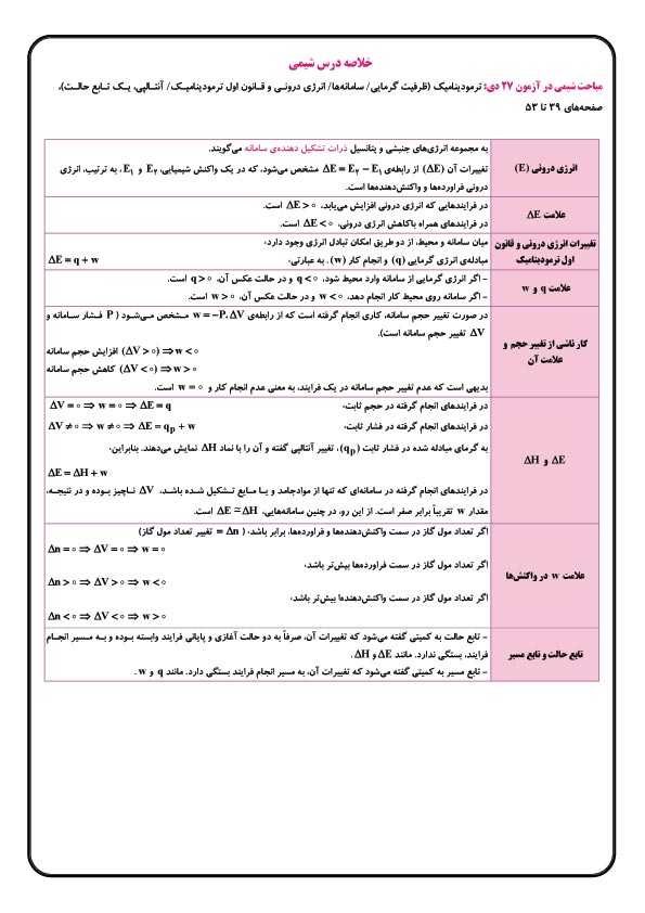 مباحث شیمی در آزمون 27 دی: ترمودینامیک (ظرفیت گرمایی/ سامانهها/ انرژی درونی و قانون اول ترمودینامیک/ آنتالپی، یک تابع حالت)، صفحههای 39 تا 53