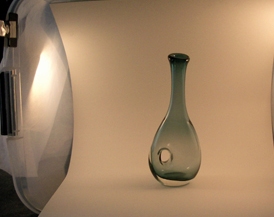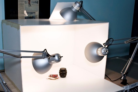 اما روش دیگری که بیشتر هم برای اشیاء کوچک مورد استفاده قرار می گیرد ساخت یک اتاقک سفید است. این اتاقک در حقیقت یک جعبه است که در داخل این جعبه باید با مقوای سفید پوشانده شود. مقوا ها باید کاملا صاف و بدون چین خوردگی باشند. معمولا در دو یا سه ضلع این جعبه پنجره هایی بزرگ تعبیه می کنند و این پنجره ها را با پارچه ای سفید و نازک می پوشانند و البته این پارچه ها هم باید صاف و بدون چروک باشند و به همان سفیدی مقوایی که در داخل جعبه کار شده است باشند. یا حتی می توانید از کاغذ نازک برای پوشاندن پنجره های اتاقک سفید خود استفاده کنید. محصول مورد نظر خود را در داخل اتاقک سفید قرار دهید . پشت هر پنجره هم یک منبع نور قرار داهید در بالایی جعبه را باز کنید دوربین شما از اینجا باید به کالای مورد نظر نگاه کند و عکس بگیرد برای ثابت نگه داشتن دوربین هم بهتر است از یک سه پایه استفاده کنید و در صورتی که سه پایه در اختیار ندارید بهتر است یک پایه برای آن بسازید تا تصویری روشن با دقت بالا داشته باشید.