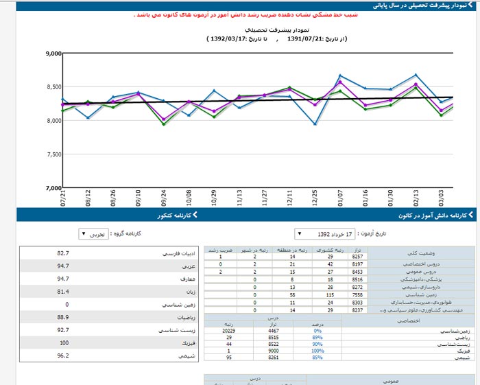 با مراجعه به بخش رتبه های برتر کنکور 92 علاوه بر امکان مشاهده اطلاعات قبولی برترها می توانید کارنامه آزمون های کانون ، نمودار ضریب رشد و کارنامه کنکور آن ها را مشاهده کنید.