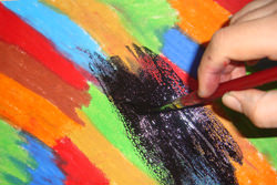 ابتدا با پاستل تمام صفحه مقوا را به رنگ های دلخواه رنگ می کنیم ،به نحوی که جایی خالی یا سفید نماند.(می توانید بنا به طرح که دارید رنگ گداری کنید و یا فقط تک رنگ و دو رنگ و..استفاده کنید.بهتر است مقوای استفاده شده برای این کار تا اندازه ای ضخیم باشد یعنی استفاده از مقوا های گرم بالا(
