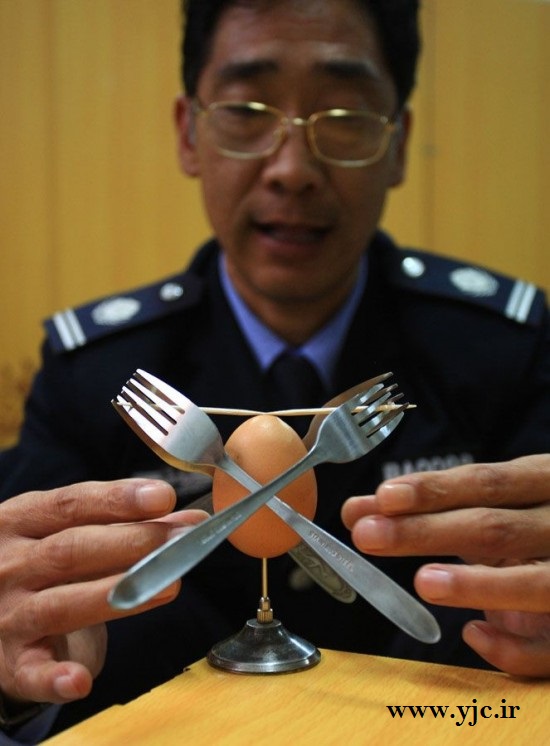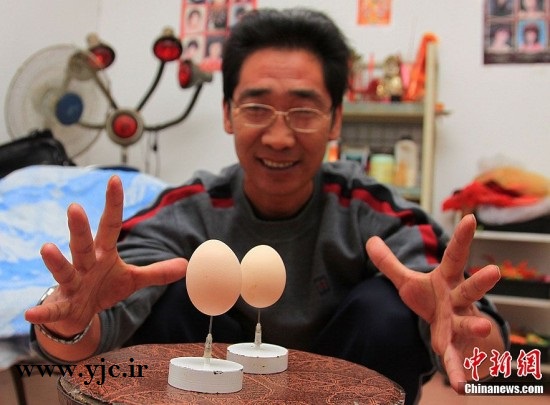 این مرد چینی که در شهر چانگشا زندگی می کند هر ماده را از تخم شتر مرغ تا کوچکترین تخم مرغ ها روی نازک ترین وسایل مانند سر سوزن نگه می دارد. او خودش را استاد این حرفه می داند و اعتقاد دارد در دنیا هیچ کس دیگری وجود ندارد که بتواند این کار را انجام دهد.