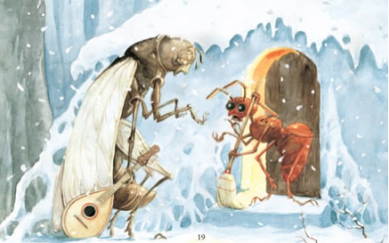 ملخ پاسخ داد: «مورچهي عزيز من گرسنهام و به شدّت سردم است. غذايي به من بده تا بخورم و چوبي به من بده تا آتشي با آن روشن کنم.» مورچه گفت: «تمام طول تابستان را چهکار ميکردي ؟ توفقط بازي ميکردي و آواز ميخواندي و مرا مسخره ميکردي. من تو را نصيحت کردم، امّا تو گوش ندادي. تمام تابستان را به آوازخواني گذراندي، حالا هم برو آواز بخوان و هر طور دوست داري زندگي کن.» بعد هم در را به روي ملخ بست. مدّت کوتاهي گذشت. مورچه دلش به حال ملخ سوخت. در خانهاش را باز کرد و ملخ را به خانهاش آورد و به او غذا داد و جاي گرمي برايش آماده کرد.
