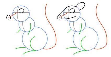 در تصوير بعدي مي بينيد که از چه خطوطي براي صورت بلند و دراز موش استفاده کرديم. کافيست دايره بزرگ را با دو خط منحني به سر بيني موش وصل کنيد. با يک بيضي نيمه نيز مي توانيد گوش آن را بکشيد.