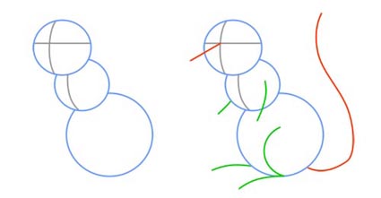 همانطور که مي بينيد، نقاشي امروز ما يک موش کارتوني است. براي شروع کار با سه دايره شروع مي کنيم. ببينيد که چطور حدود کلي موش کارتوني مشخص مي شود! اين کار کمک مي کند که ادامه ي نقاشي راحت تر شود.سپس همانند تصوير زير خطوط قرمز و سبز را در جاهاي مشخص شده بکشيد. اين خطوط نيز در کشيدن اعضاي بدن موش کارتوني شما کمک فراواني مي کند.