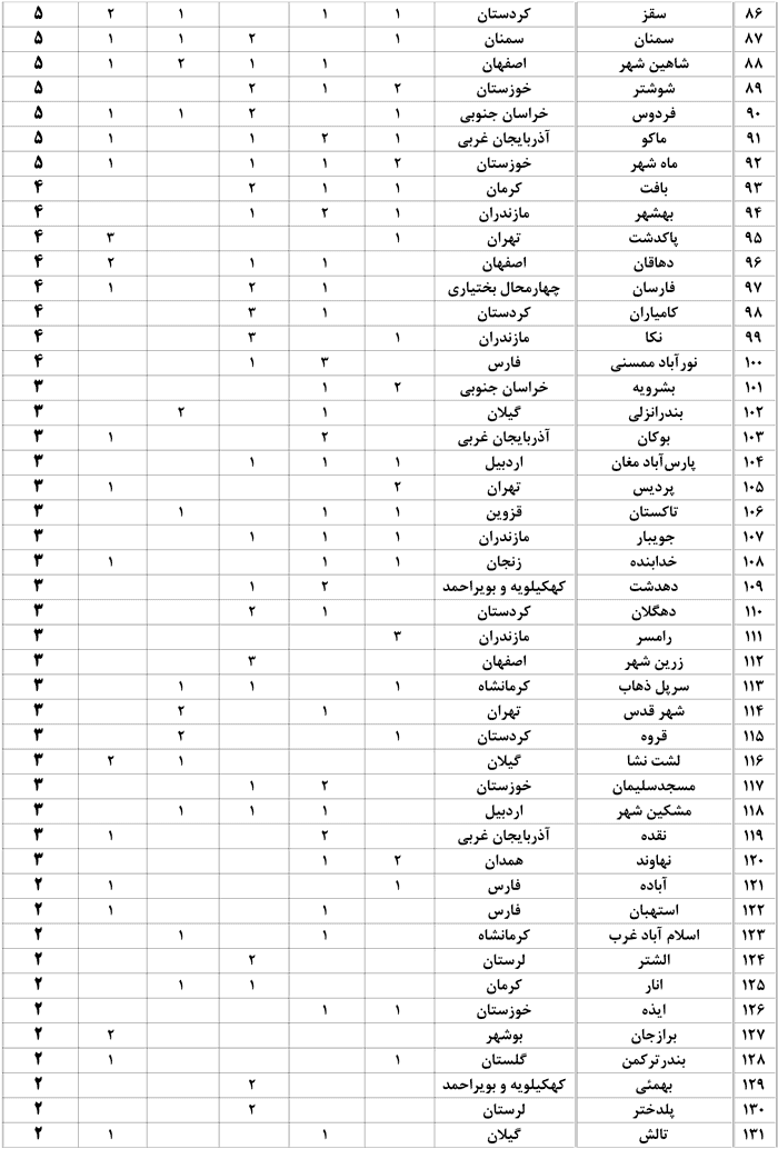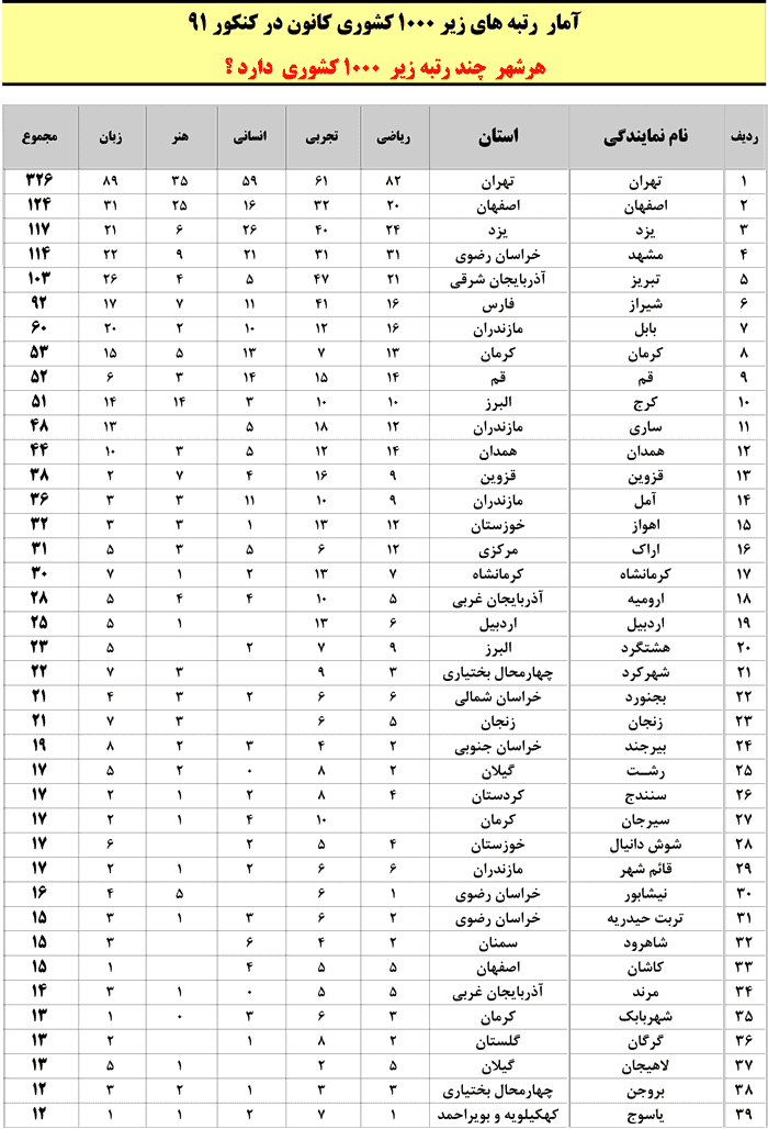 هر شهر چند رتبه زیر 1000 کشوری در کنکور 91 دارد ؟