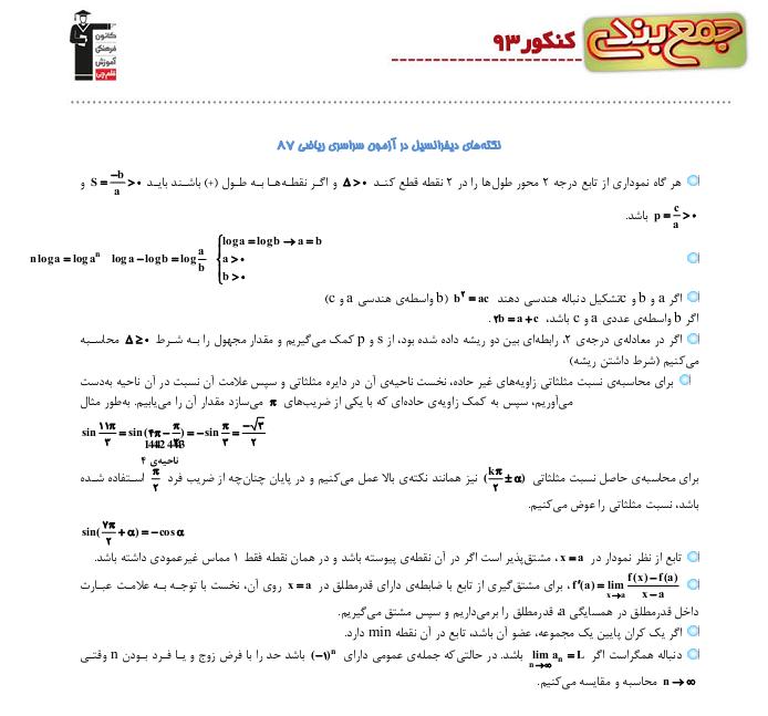 در زیر نکتههای درس دیفرانسیل در کنکور سراسری سال 87 را برای شما آورده ایم