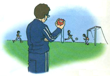 در دستش ساعت ثانيهشمار(كرنومتر) است.