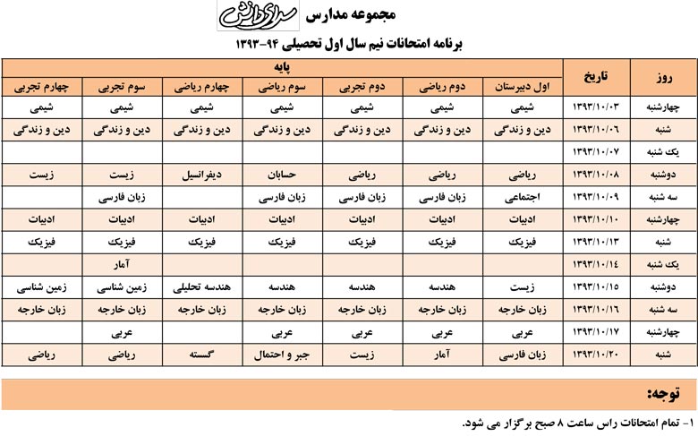 برنامه ی امتحانی دبیرستان و پیش دانشگاهی مدارس سرای دانش