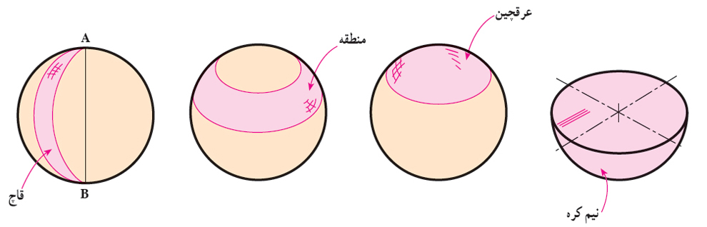 بخشهای گوناگون كره (قاچ، عرقچين، منطقه و نيمكره)، در شكل زیر معرفی شدهاند.