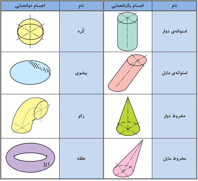دستهی بزرگی از اجسام، دارای سطوحی غیرتخت یا منحنی هستند؛ مانند استوانه، مخروط و كره. در جدول زیر، تعدادی از این اجسام، معرفی شدهاند.