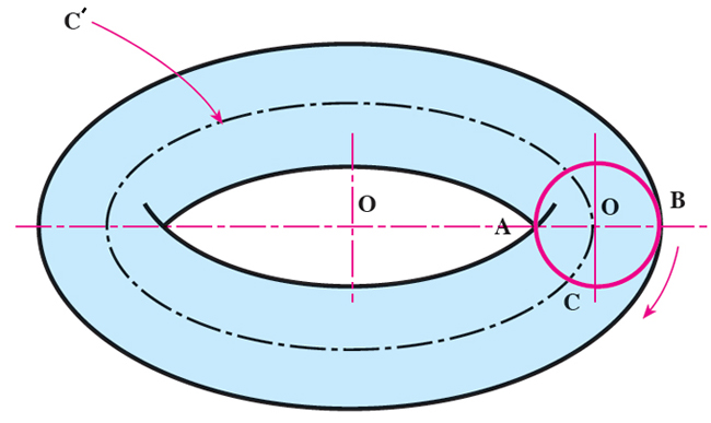 اگر دایرهی C، چنان دوران كند كه مركز آن همیشه متكی بر یك دایرهی دیگر به نام 'C بوده و سطح آن نیز عمود بر 'C باشد، حجمی پدید میآید كه آن را حلقه مینامیم. این حجم، در حقیقت استوانهای است كه آن را به شكل حلقه درآورده باشند.