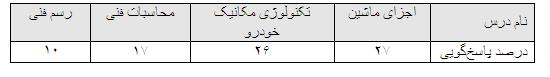 با ارزیابی انجام گرفته شده از این آزمون، مشاهده میشود که کمترین درصد پاسخگویی به سؤالات، مربوط به دروس رسم فنی با 10 درصد و همچنین بیشترین درصد پاسخگویی به سؤالات در درس اجزای ماشین با 27 درصد پاسخگویی بوده است.