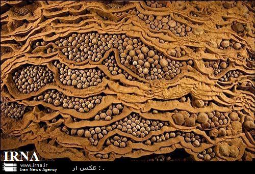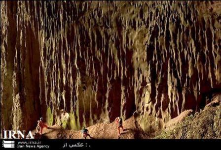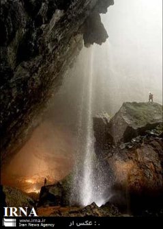 در آستانه ورود به غار يک ستون غول پيکر از رسوبات کربنات کلسيم همانند برجي بلند خودنمايي مي کند.