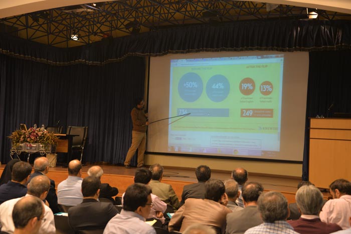 این همایش با صحبت های بابک ندرخانی مدیرعامل شرکت رهپویان دانش و اندیشه در مورد "سیستم آموزش وارونه[1]" آغاز شد. ایشان با اشاره به سایتهای بینالمللی که مباحث آموزشی را در اختیار دانشآموزان و مخاطبان قرار میدهند این سوال را مطرح کردند که ما در ایران چه کار می توانیم انجام دهیم؟