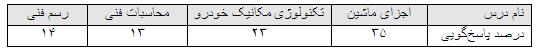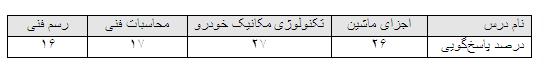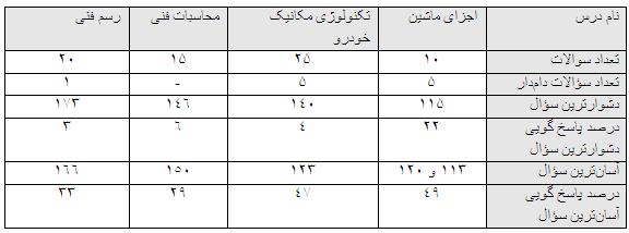 با ارزیابی انجام گرفته شده از این آزمون، مشاهده میشود که کمترین درصد پاسخگویی به سؤالات مربوط به درس محاسبات فنی با 13 درصد و همچنین بیشترین درصد پاسخگویی به سؤالات در درس اجزای ماشین با 35 درصد پاسخگویی بوده است.