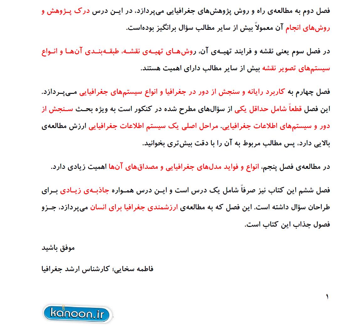 جغرافیای دورهی پیشدانشگاهی مشتمل بر 6 فصل است. از این کتاب نیز طبق بودجهبندی کنکور، 5 سؤال مطرح میگردد.
