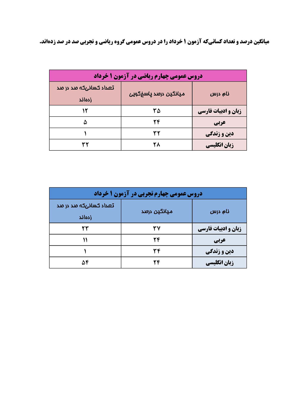 میانگین درصد و تعداد صد درصدهای دروس عمومی آزمون 1 خرداد