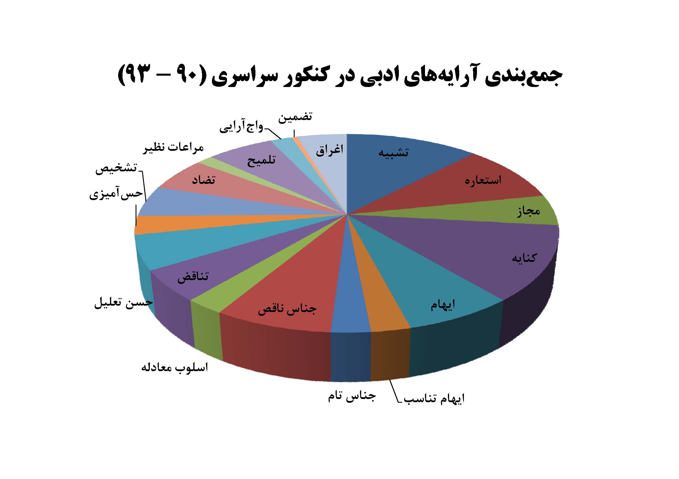 میتوانید آرایههای ادبی را از: درسهای«1، 2، 5، 12، 17 و 23» کتاب ادبیات فارسی 2، درسهای «8 و 17» ادبیات فارسی 3 و درس «14» زبان فارسی 3 مطالعه نمایید.نمودار آمده، جمعبندی آرایههایی است که از کنکور سال 90 تا کنکور سال 93، در چهار رشتهی آزمایشی (ریاضی، تجربی، هنر و زبان) مطرح شده است. با این نمودار میتوانید از آرایههای پراقبالتر در کنکورهای اخیر مطلع شوید.