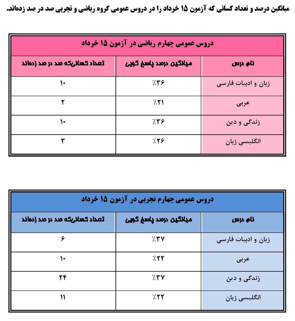 میانگین درصد و تعداد صد در صدهای دروس عمومی در آزمون 15 خرداد