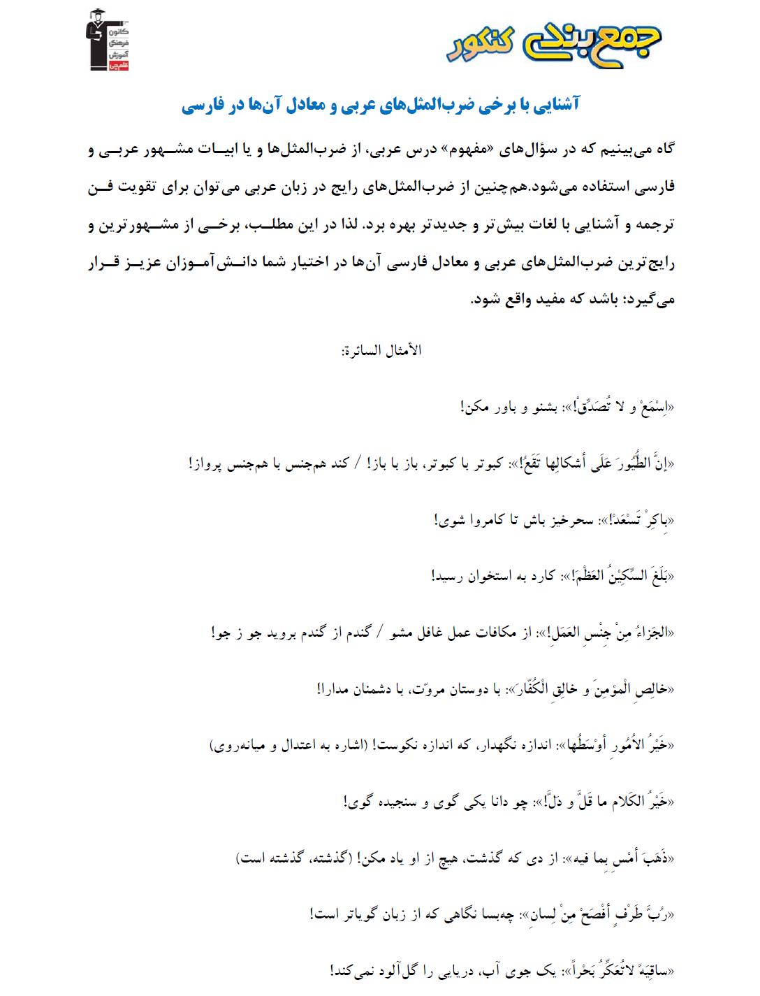 گاه میبینیم که در سؤالهای «مفهوم» درس عربی، از ضربالمثلها و یا ابیات مشهور عربی و فارسی استفاده میشود.