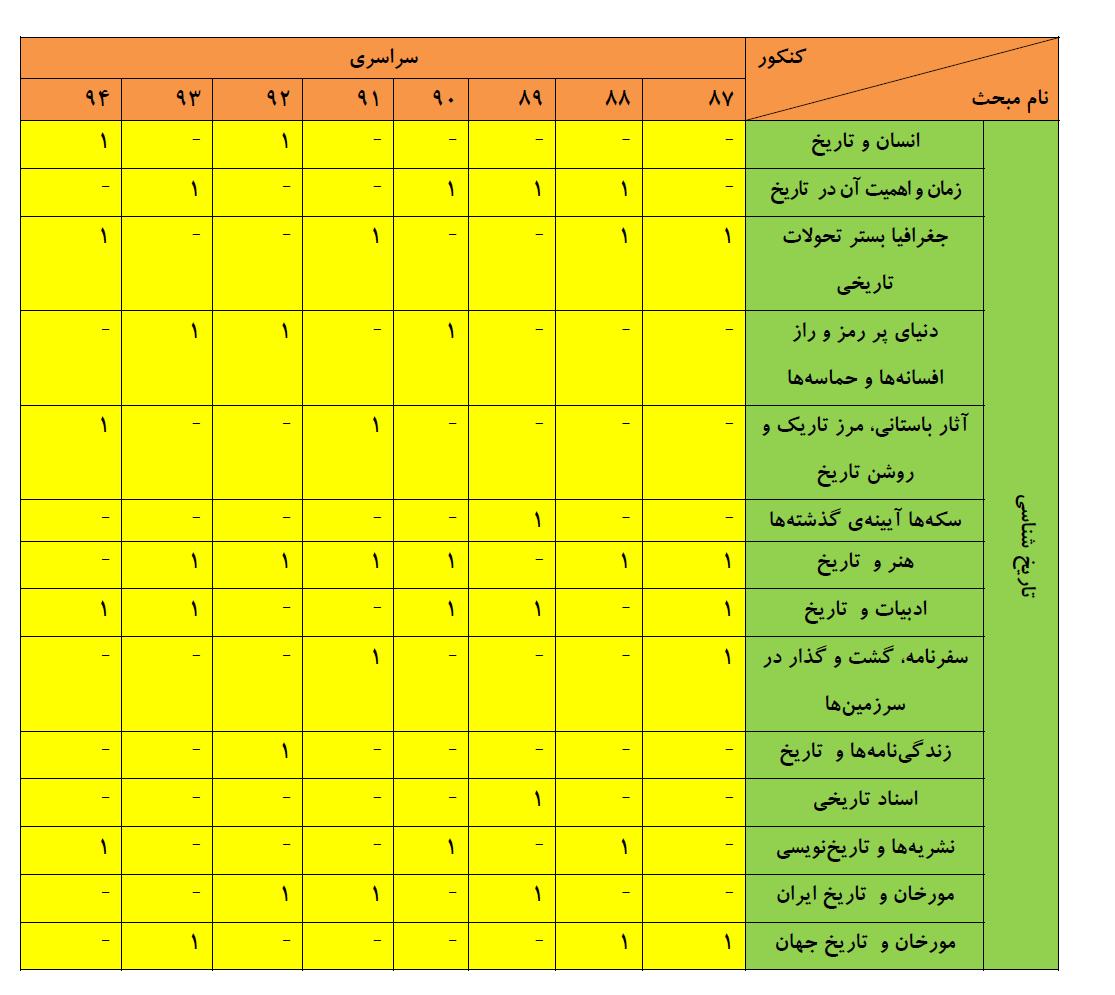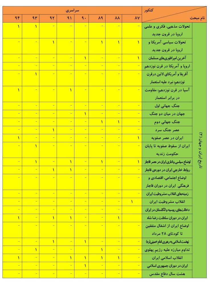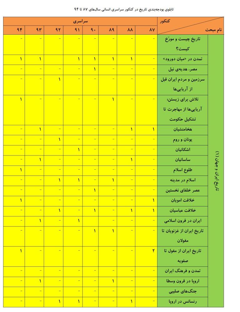 بودجهبندی تاریخ در کنکور سراسری انسانی سالهای 87 تا 94