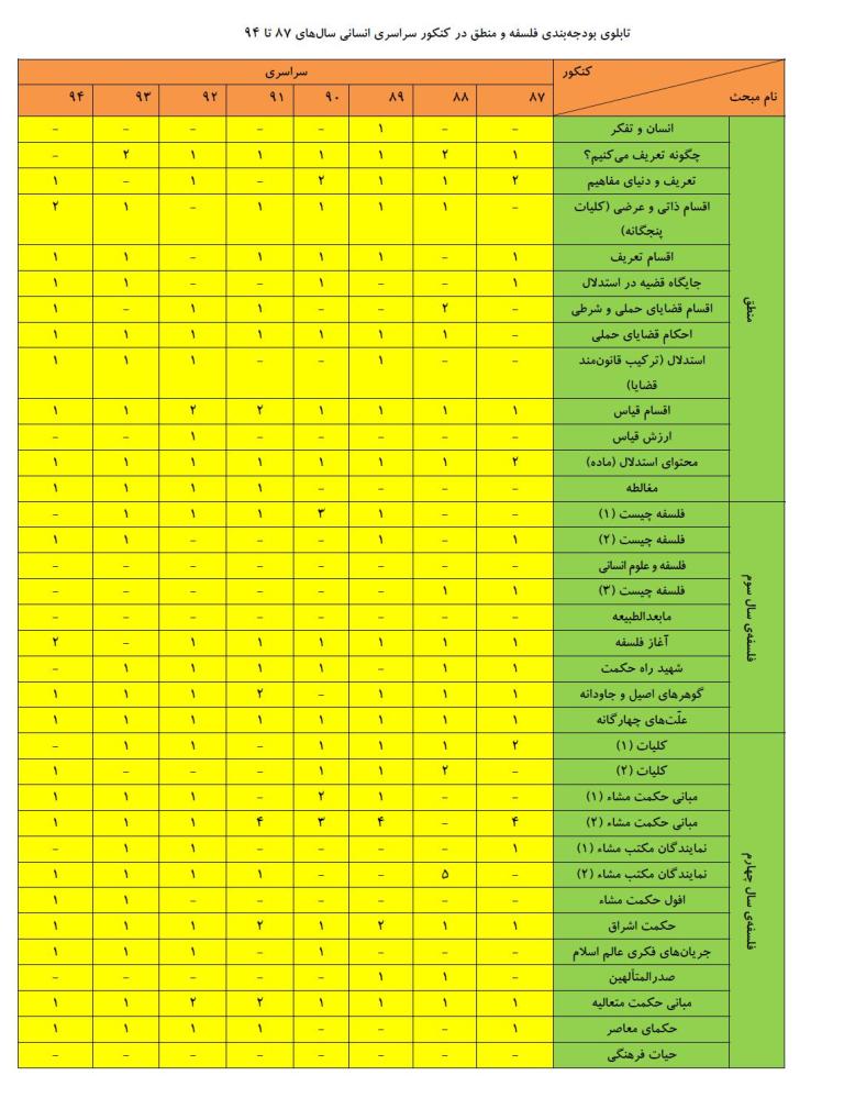 بودجهبندی فلسفه و منطق درکنکور سراسری انسانی سالهای 87 تا 94