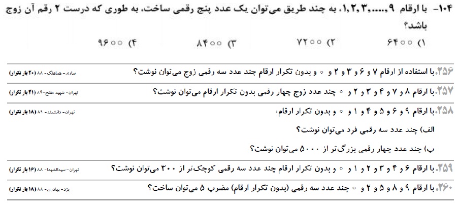 سوال 104 کنکور ریاضی و سوالهای 256 تا 260کتاب پرتکرار