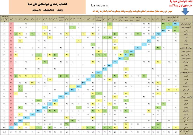 در این لیست در مواردی که در یک رشته در یک دانشگاه، بیش از 50 درصد قبولی کانون داشته ایم (اگر از استان خود به استان خود قبول شده باشید) آن خانه را آبی کرده ایم. زیر 30 درصد را زرد. در نتیجه کمکی که این جدول به شما میتواند بکند این است که بدانید آبی ها مواردی هستند که شما از شهر خودتان می توانید در آنها قبول شوید در نتیجه در انتخاب رشتهی خود لحاظ کنید.