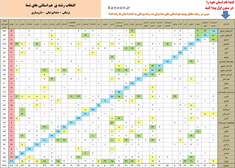 در شهرهایی مثل شیراز و تبریز و یزد تعداد قبولی در رشته پزشکی زیاد بوده است ولی از بین این قبولیها از تهران تعداد خیلی کمی و حتی در مورد شهر یزد هیچ کسی قبول نشده است زیرا این شهرها دانشآموزان بومی را پذیرفته اند. پس در این جدول بومی بودن را نیز متوجه می شوید.